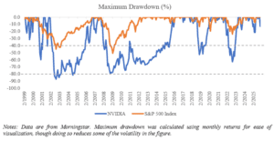 Second, owners of Nvidia’s stock have experienced a tremendously bumpy ride. Since its inception, its stock has declined by over 80% twice (in fact almost 90% on one of those occasions), and by over 40% another handful of times. As recently as April 2025 its stock declined by 35%. This stock was no straight line and those who held it experienced a volatility significantly greater than those invested in the S&P 500. See the chart below, which maps drawdowns, or how sharply an investment fell over a particular time period, in Nvidia’s stock (blue line) compared to the S&P 500 Index (orange line).